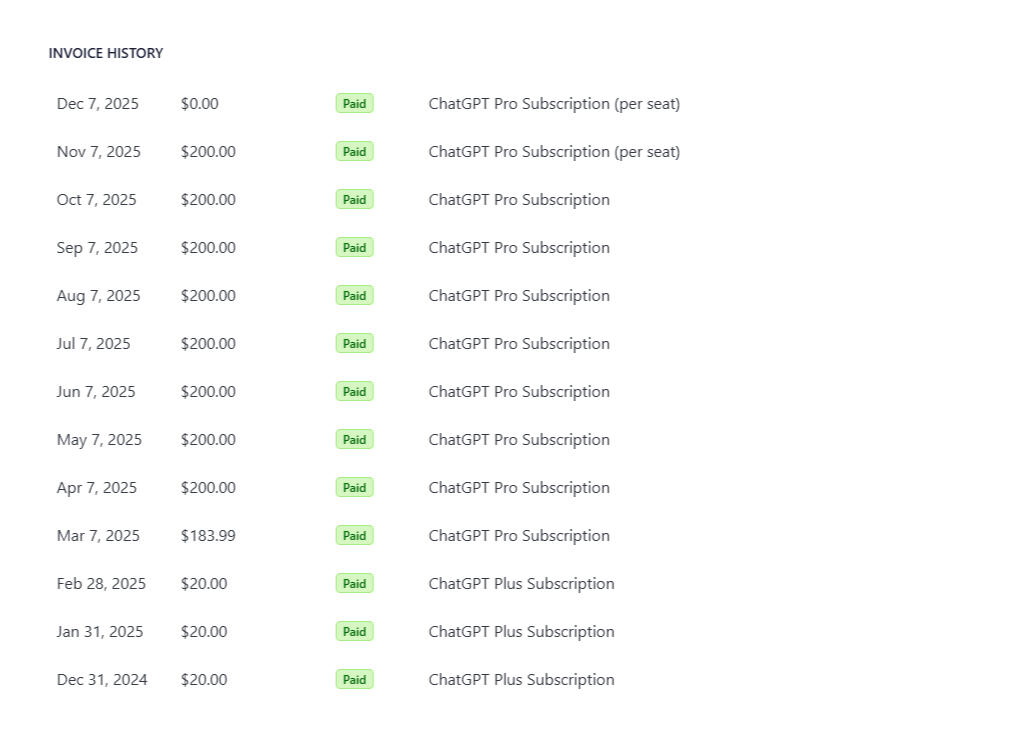 From April 2025 until Nov 2025 the monthly budget remained steady at $200 then Open AI offered December free of charge.